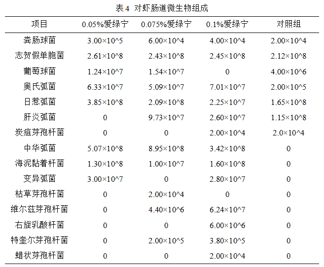 菌仅见于0.1%888集团宁组。。。。同时,,,,,,,常见病原菌肝炎弧菌数目显着下降,,,,,,,日惹弧菌在0.1%888集团宁组下降了一个数目级;;;;奧氏弧菌上升了两个数目级,,,,,,,中华弧菌和变异弧菌仅见于试验组。。。???杉,,,,,,,饲料中添加0.05%、